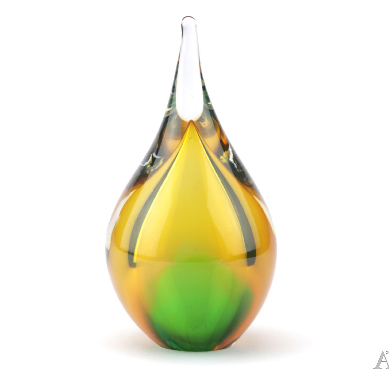 De kleine Glasdruppel in het goudgroen gevlamd heeft de vorm van een kleine sierlijke druppel. In de kern van de as-druppel bevindt zich een klein as-reservoir waar een gedeelte van het crematie-as in bewaard kan worden. Het as-reservoir wordt afgesloten d.m.v. een zelf-hechtend sluitplaatje. Deze druppel is niet transparant en het crematie-as is dus niet zichtbaar. In combinatie met de warme kleurschakeringen krijgt het as-gedenkornament een extra dimensie en een prachtige uitstraling. Deze kleine glasdruppel is verkrijgbaar in een aantal verschillende kleurschakeringen. Ze zijn gemaakt van kristalglas en met de hand vervaardigd. Dit maakt elk ornament uniek. De glasdruppel is leverbaar in één maat: 14 cm hoog/inhoud 50 ml. De glasdruppel is een lieflijk aandenken ter herinnering aan uw dierbare. Bezoek ook onze showroom en bekijk onze uitgebreide collectie sierurnen. Prijs EUR 78,00