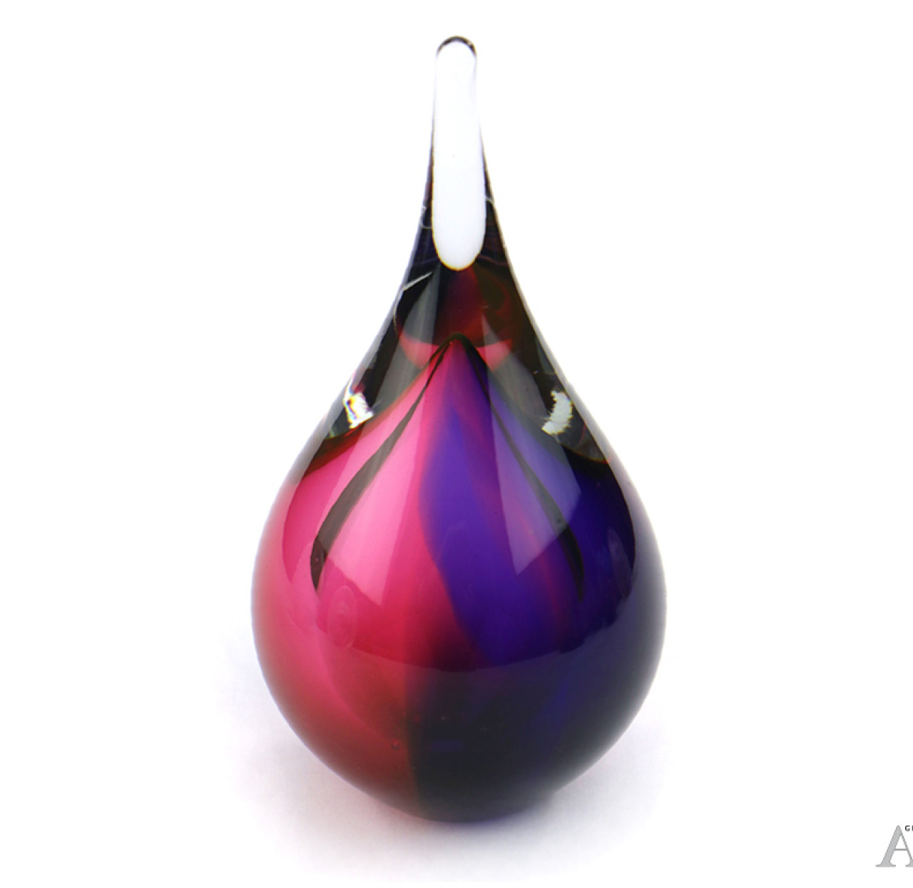 De kleine Glasdruppel in de kleur roze/blauw heeft de vorm van een kleine sierlijke druppel. In de kern van de as-druppel bevindt zich een klein as-reservoir waar een gedeelte van het crematie-as in bewaard kan worden. Het as-reservoir wordt afgesloten d.m.v. een zelf-hechtend sluitplaatje. Door de transparantie van het kristalglas is het crematie-as deels zichtbaar. In combinatie met de warme kleurschakeringen krijgt het as-gedenkornament een extra dimensie en een prachtige uitstraling. Deze kleine glasdruppel is verkrijgbaar in 6 unie-kleuren en in een aantal verschillende kleurschakeringen. Ze zijn gemaakt van kristalglas en met de hand vervaardigd. Dit maakt elk ornament uniek. De glasdruppel is leverbaar in één maat: 14 cm hoog/inhoud 50 ml. De glasdruppel is een lieflijk aandenken ter herinnering aan uw dierbare. Bezoek ook onze showroom en bekijk onze uitgebreide collectie sierurnen. Prijs EUR 78