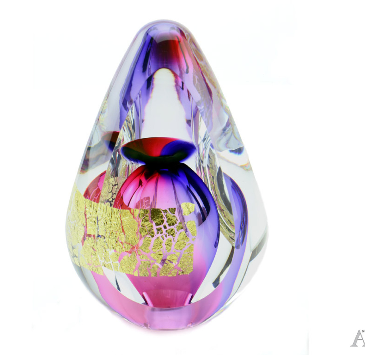 Dit prachtige as-gedenkornament is van kristalglas. De kleur is goud met een paars/roze kern en d.m.v. een zelf-hechtende sluitplaat is het as-reservoir afgesloten. Deze urn is leverbaar in één maat: 15 cm/60 ml. Deze glaskegel is een waar sieraad ter herinnering van uw dierbare. Alle as-gedenkornamenten zijn met de hand vervaardigd, zo is elk ornament uniek. Prijs EUR 338,00 (inclusief vullen en afsluiten)