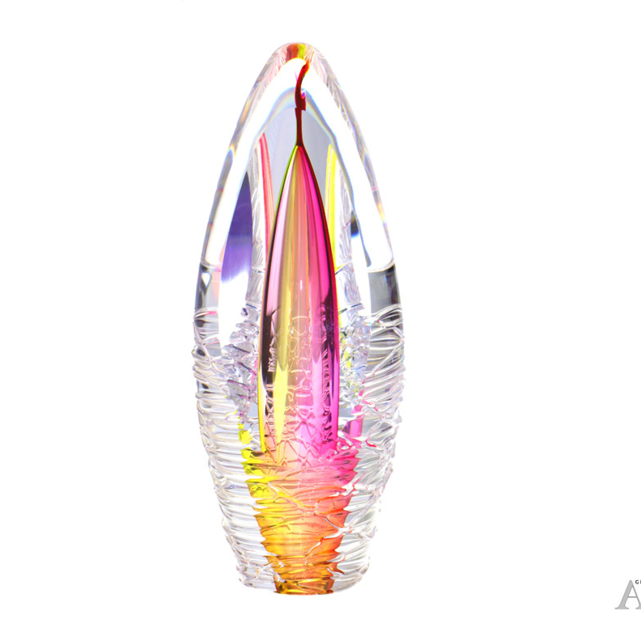 Glaskegel Spirit glans roze/geel is een prachtige as-gedenkornament en is van kristalglas gemaakt. De kleur van de kern is roze en geel. D.m.v. een zelf-hechtende sluitplaat is het as-reservoir afgesloten. Deze urn is leverbaar in één maat: 19 cm/70 ml. Deze glaskegel is een waar sieraad ter herinnering van uw dierbare. Alle as-gedenkornamenten zijn met de hand vervaardigd, zo is elk ornament uniek. Prijs EUR 336,00 (inclusief vullen en afsluiten)