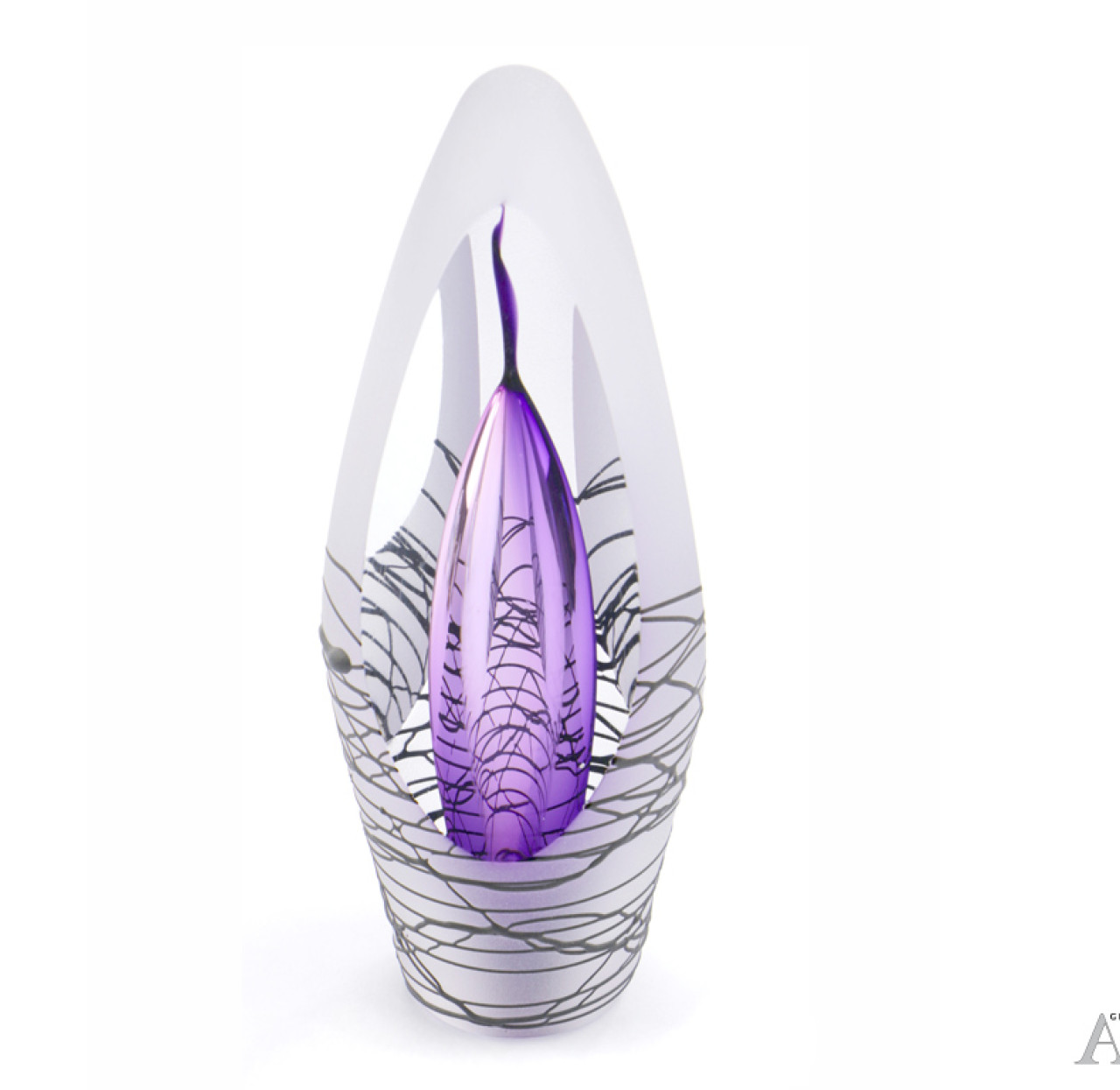 Glaskegel Spirit Krakele paars is een prachtige as-gedenkornament en is van kristalglas gemaakt. De kleur van de kern is paars met zwart krakele. D.m.v. een zelf-hechtende sluitplaat is het as-reservoir afgesloten. Deze urn is leverbaar in één maat: 19 cm/70 ml. Deze glaskegel is een waar sieraad ter herinnering van uw dierbare. Alle as-gedenkornamenten zijn met de hand vervaardigd, zo is elk ornament uniek. Prijs EUR 336,00 (inclusief vullen en afsluiten)