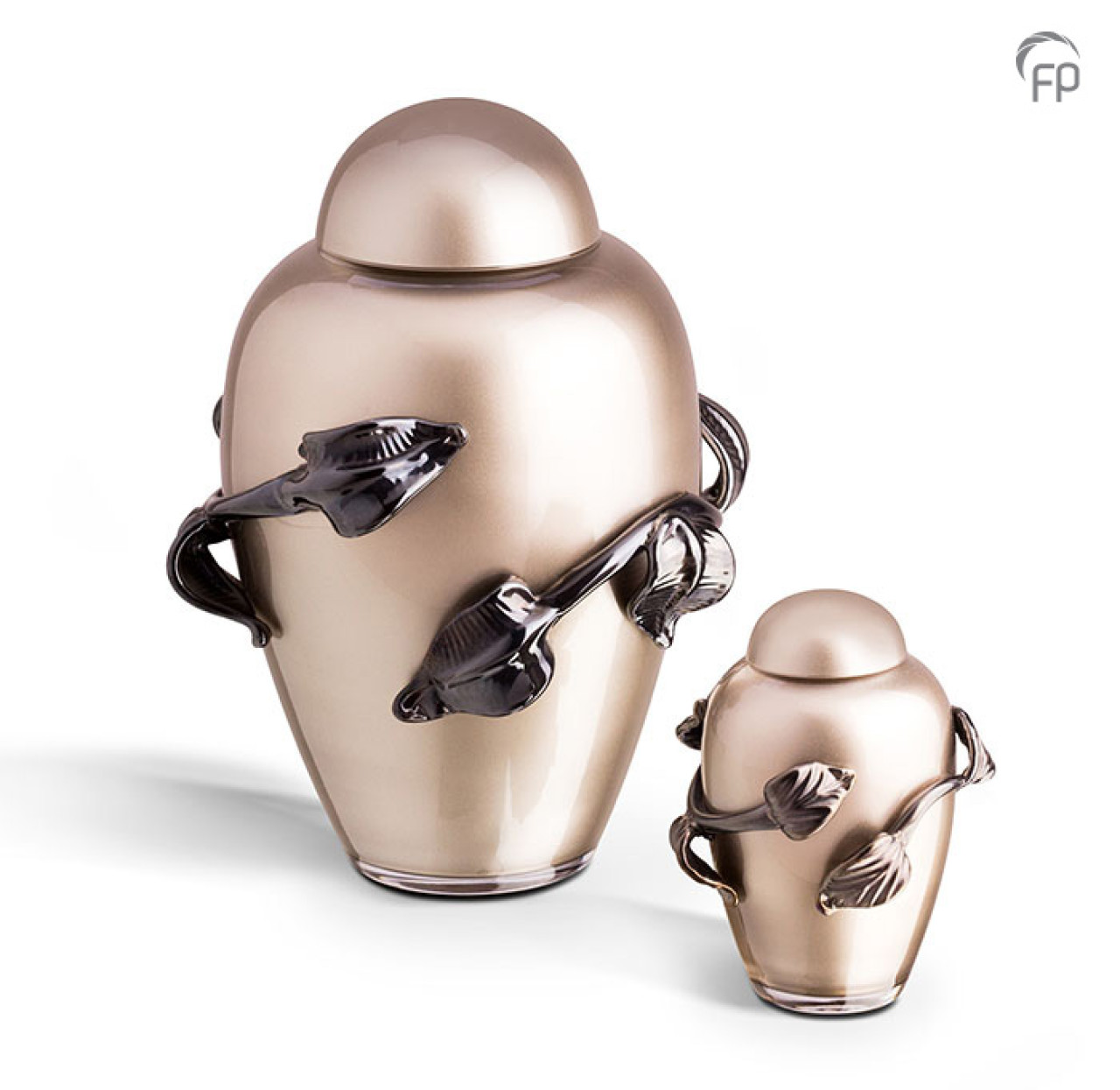 Deze glazen urn is handgeblazen en is Cappuccino kleurig met een bladversiering van Boheems kristal. Deze sierurn is verkrijgbaar in twee maten: 3,2 liter/28 cm hoog en 0,40 liter/14 cm. Een prachtig symbool om uw geliefde in te gedenken. Bezoek ook onze showroom en bekijk onze uitgebreide collectie sierurnen. Prijs EUR 275,00/EUR 169,00