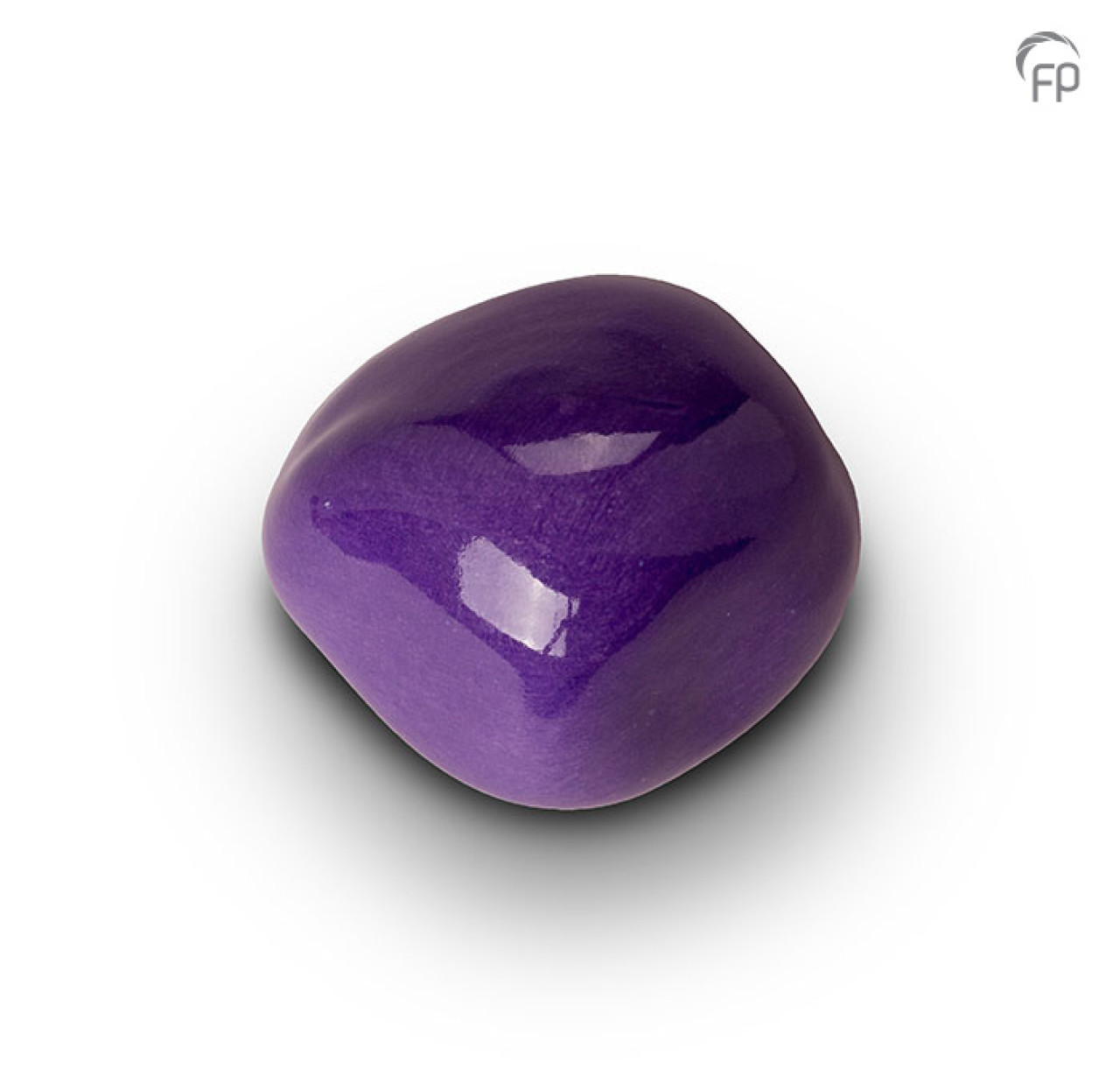 Dit Keramische Knuffelkeitje is paars glanzend en door een keramist van klei geboetseerd en vervolgens geëmailleerd. Het keitje is ongeveer 6x5x2 cm groot en heeft een inhoud van 0,05 liter. Een mooi symbool om uw geliefde te gedenken. Deze mini urn kan ook uitgevoerd worden in andere kleuren. Bezoek ook onze showroom en bekijk onze uitgebreide collectie sierurnen. Prijs EUR 59