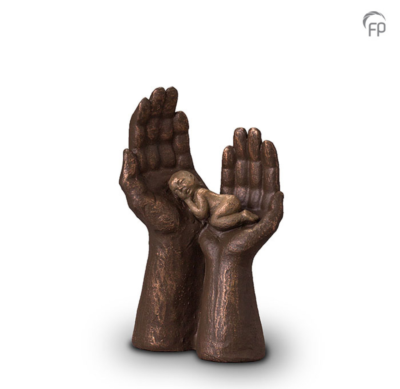Deze keramische urn 'Handen met Baby' is een urn met een symbolische betekenis. Deze urn wordt met de hand gemaakt door de Nederlandse keramist Geert Kunen, waardoor iedere urn uniek is. Het keramiek wordt afgewerkt met een bronskleurige finish (soms iets 'groenig'). Deze urn wordt uitgevoerd in één maat (0,30 liter/21 cm hoog) . Een prachtig symbool om uw geliefde in te gedenken. Bezoek ook onze showroom en bekijk onze uitgebreide collectie sierurnen. Prijs EUR 299,00