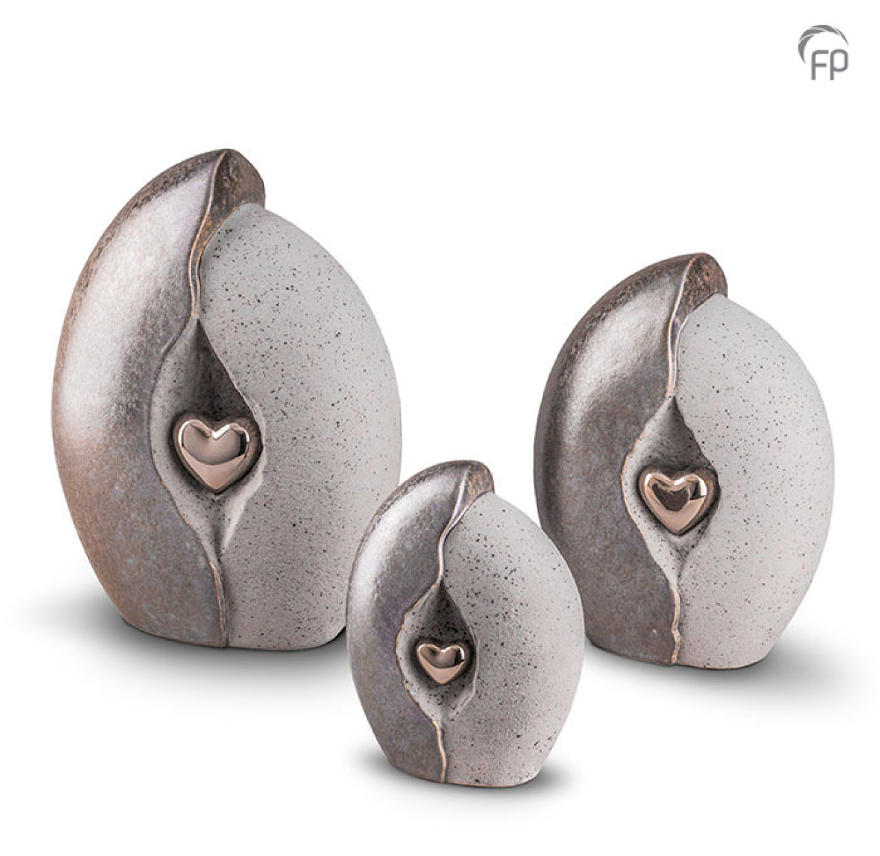De keramische sierurnen met zilver hart zijn er in 3 verschillende maten (3,8 liter / 2,2 liter / 0,8 liter), hier afgebeeld in een taupe/grijze tint. Een prachtig symbool om uw geliefde in te gedenken. Bezoek ook onze showroom en bekijk onze uitgebreide collectie sierurnen. Prijs EUR 355,00 / EUR 285,00 / EUR 205,00