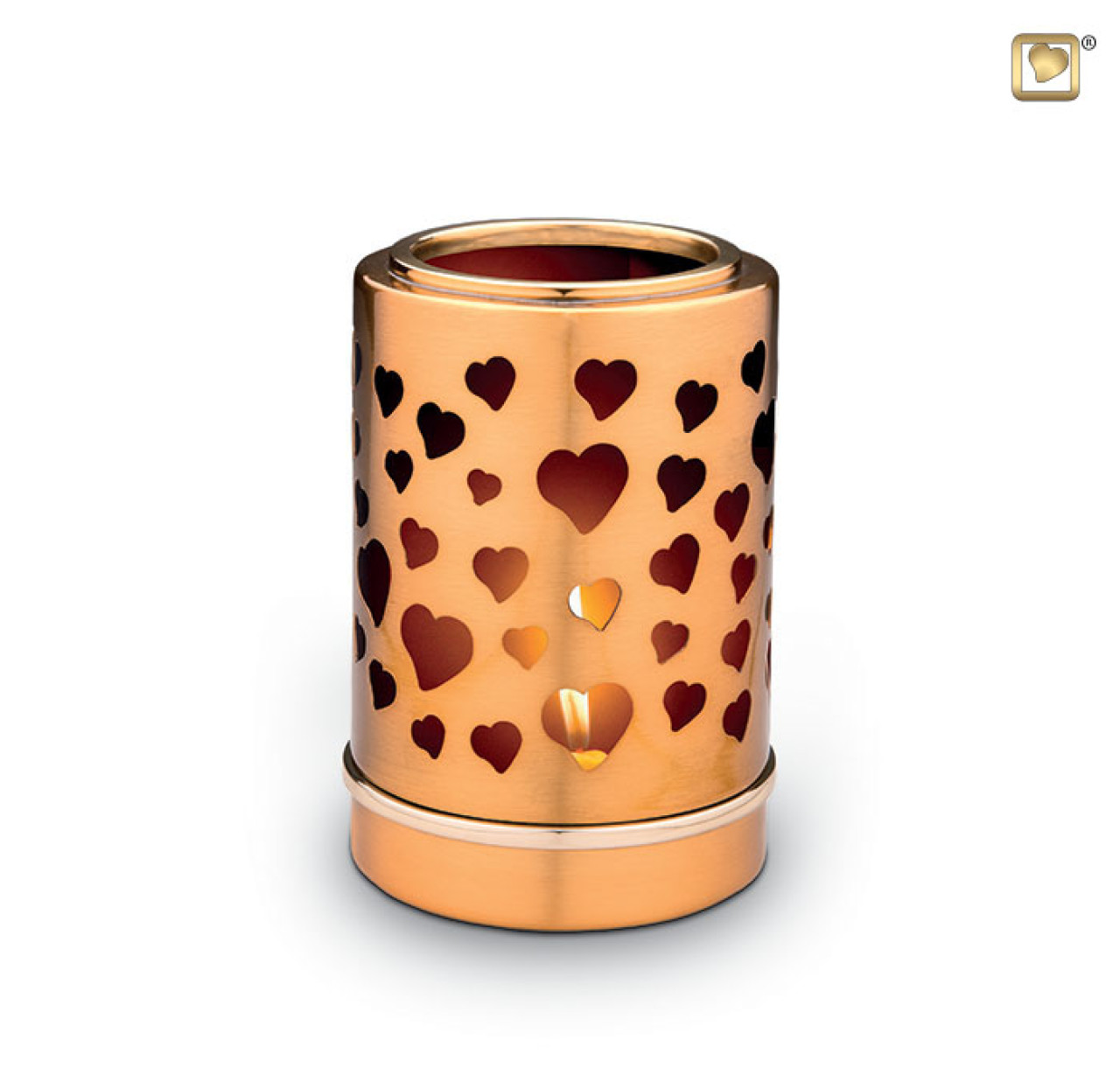 De sierurn messing kaarshouder Harten is een kwaliteitsproduct en wordt van hoogwaardig metaal vervaardigd. Om de duurzaamheid van de messing kwaliteitsproducten te garanderen wordt ieder product voorzien van een speciale finish. Dit is een unieke laklaag die de urn beschermt en tegelijkertijd voorziet van een glanzende afwerking. De inhoud van de kaarshouder is 0,20 liter en is 16 cm hoog. Prijs EUR 160,00 (inclusief vullen)