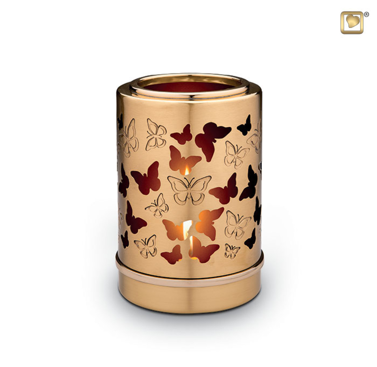 De sierurn messing kaarshouder Vlinders is een kwaliteitsproduct en wordt van hoogwaardig metaal vervaardigd. Om de duurzaamheid van de messing kwaliteitsproducten te garanderen wordt ieder product voorzien van een speciale finish. Dit is een unieke laklaag die de urn beschermt en tegelijkertijd voorziet van een glanzende afwerking. De inhoud van de kaarshouder is 0,20 liter en is 16 cm hoog. Prijs EUR 160,00 (inclusief vullen)