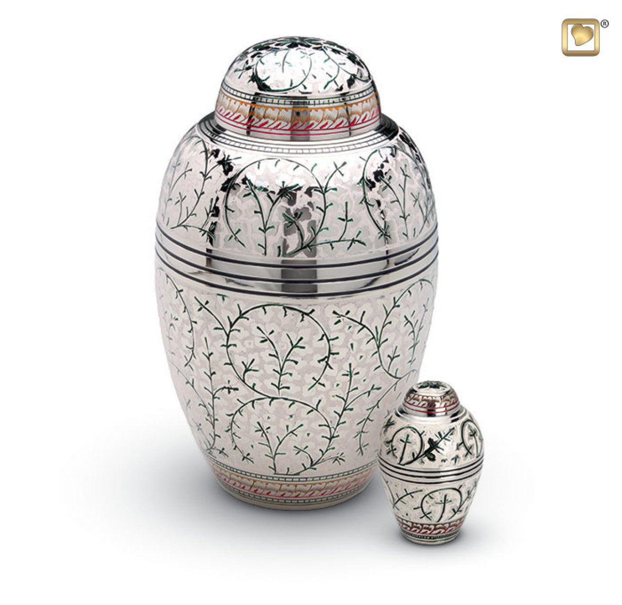 De sierurn messing is een kwaliteitsproduct en wordt van hoogwaardig metaal vervaardigd. Om de duurzaamheid van de messing kwaliteitsproducten te garanderen wordt ieder product voorzien van een speciale finish. Dit is een unieke laklaag die de urn beschermt en tegelijkertijd voorziet van een glanzende afwerking. De inhoud van de urn is 3,40 liter en is 26 cm hoog. Deze urn is ook verkrijgbaar in keepsake uitvoering, waarvan de urn een inhoud heeft van 0,05 liter en is 8 cm hoog. Prijs EUR 314,00/EUR 80,00 (inclusief vullen)