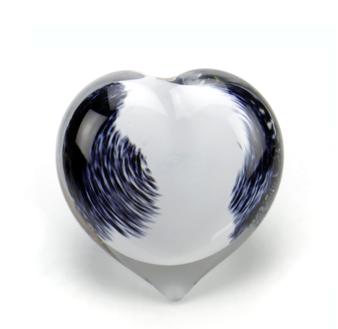 Het as-Hart in de kleur opaque zwart/wit heeft de vorm van een sierlijk hart. In de kern bevindt zich een klein as-reservoir waar een gedeelte van het crematie-as in bewaard kan worden. Het as-reservoir wordt afgesloten d.m.v. een zelf-hechtend sluitplaatje. Dit as-hart is gemaakt van kristalglas en met de hand vervaardigd. Dit maakt elk ornament uniek. Het as-hart is leverbaar in de maat: 8-9 cm hoog/inhoud 20 ml. Het as-hart is een lieflijk aandenken ter herinnering aan uw dierbare. Bezoek ook onze showroom en bekijk onze uitgebreide collectie sierurnen. Prijs EUR 51,00