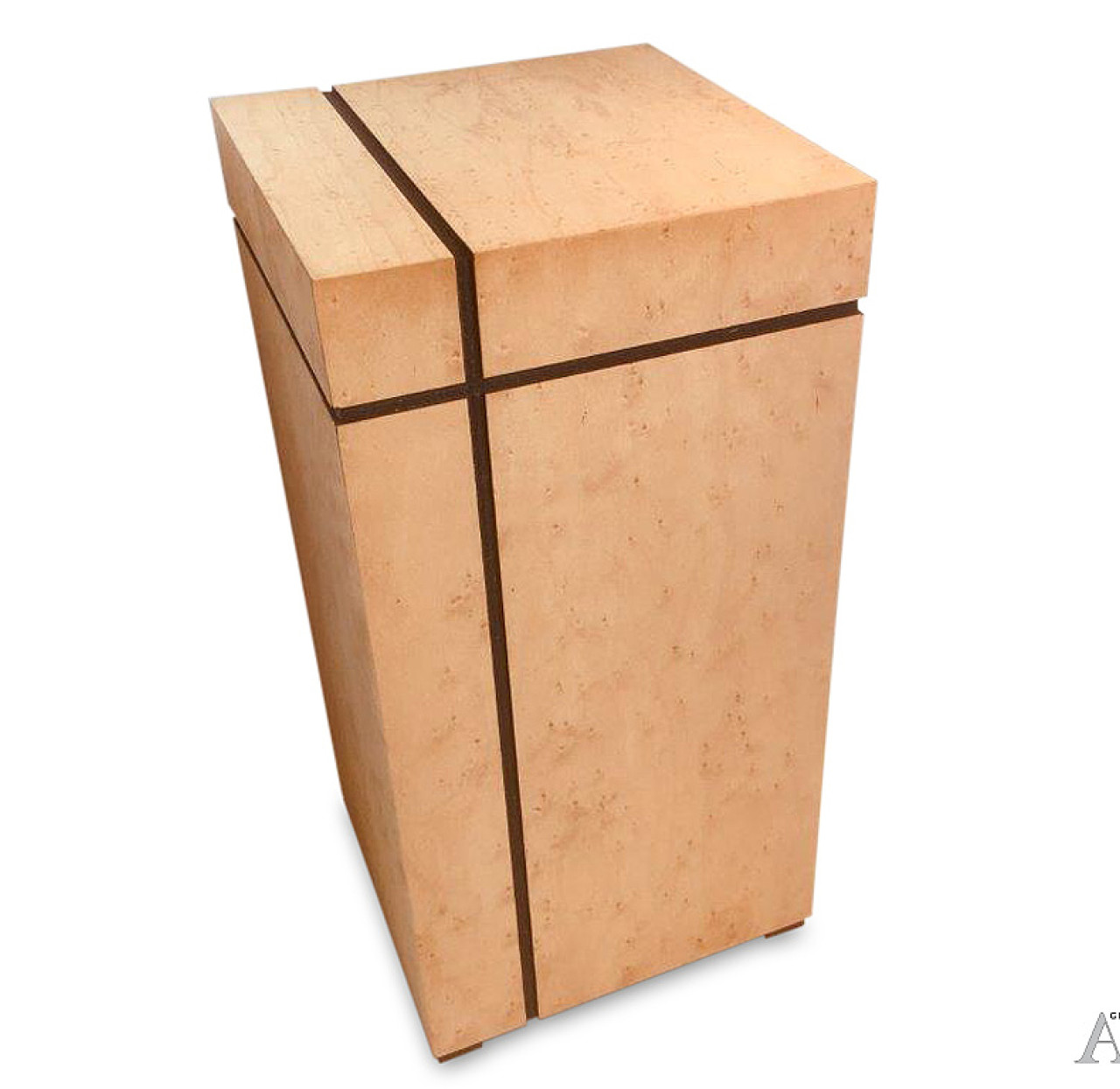 Deze mooie staande houten urnzuil is gemaakt Esdoornhout, ook wel Bird's Eye Maple genoemd. Het hout is bewerkt met Chinese houtolie. De strakke vormgeving en verdiepte versiering maken het ontwerp apart. De afmeting van deze urnzuil is 30 x 15 x 15 cm en heeft een inhoud van 4,7 liter. Prijs EUR 653,00 (inclusief vullen)