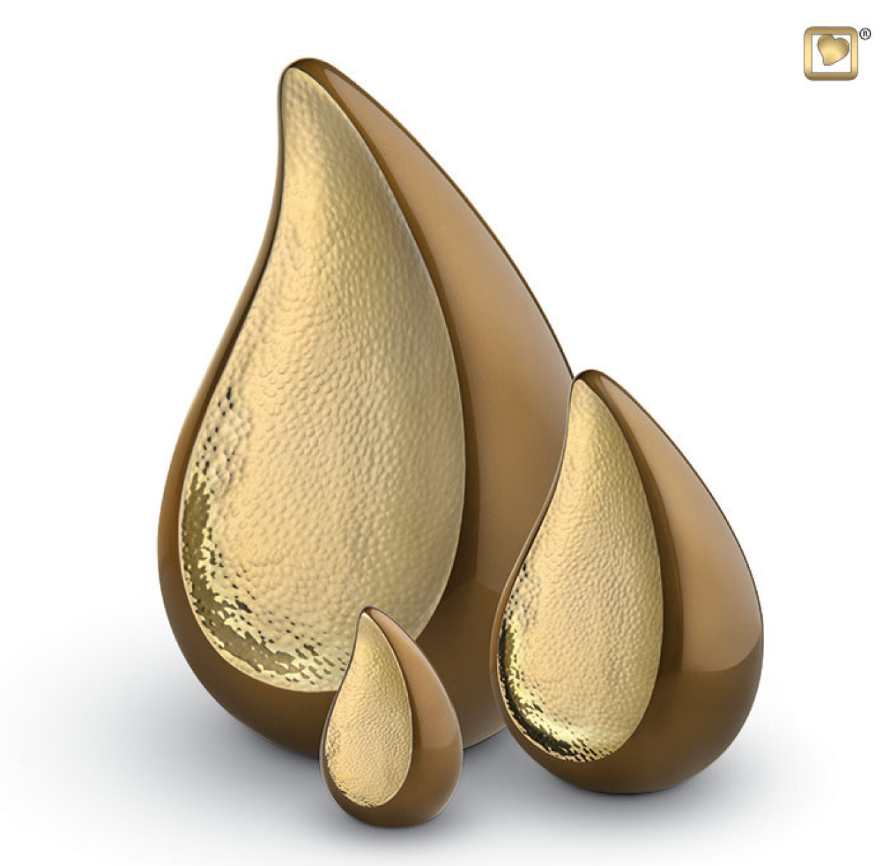 De sierurnen 'Teardrop' zijn er in 3 verschillende maten (2,4 liter / 0,4 liter / 0,05 liter), hier afgebeeld in een gehamerde bewerking en in goudkleur. Een prachtig symbool om uw geliefde in te gedenken. Prijs EUR 405,00 / EUR 289,00 / EUR 85,00
